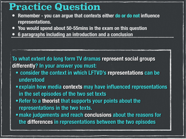 ReplyDelete15/4- Q3 from 19/3- T: you need to try and address context and link this to theory by explaining in detail how it applies. In your examples from the text, be clear to use media terms in your analysis such as costume, camera shots etc...